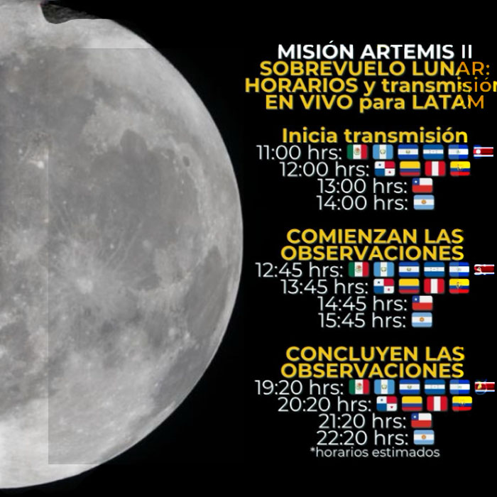 El martes 7, a las 13:25 ET, Orión saldrá de la esfera de influencia lunar (a 6.600 km). La transmisión en vivo del sobrevuelo podrá verse desde la 1 p.m. ET en NASA+, Amazon Prime, Apple TV, Hulu, Netflix, HBO Max, Roku y en el canal de YouTube de la agencia. La cobertura será continua y se actualizará con cualquier cambio operativo.